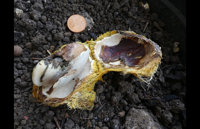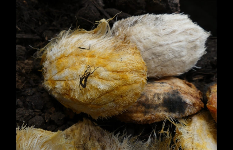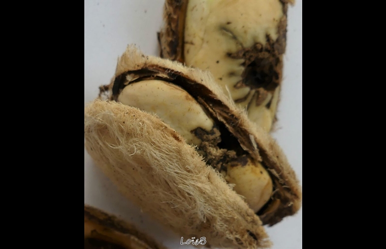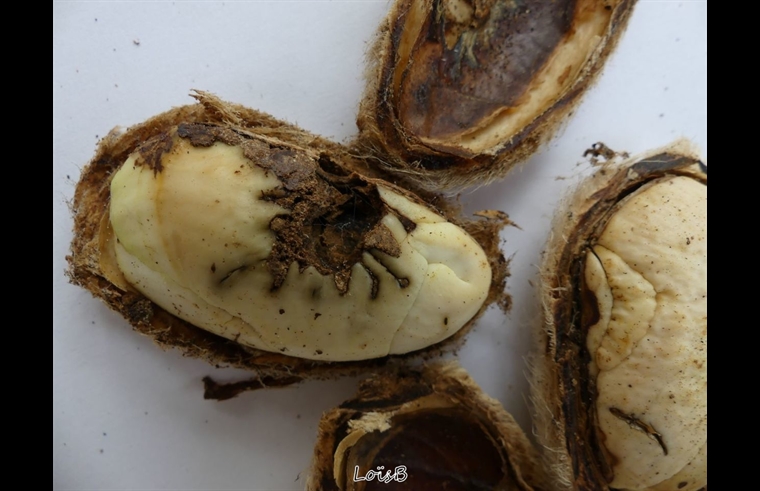 La cosse, blanche et poilue du noyau, ouverte : " zone de développement" de l'insecte .
